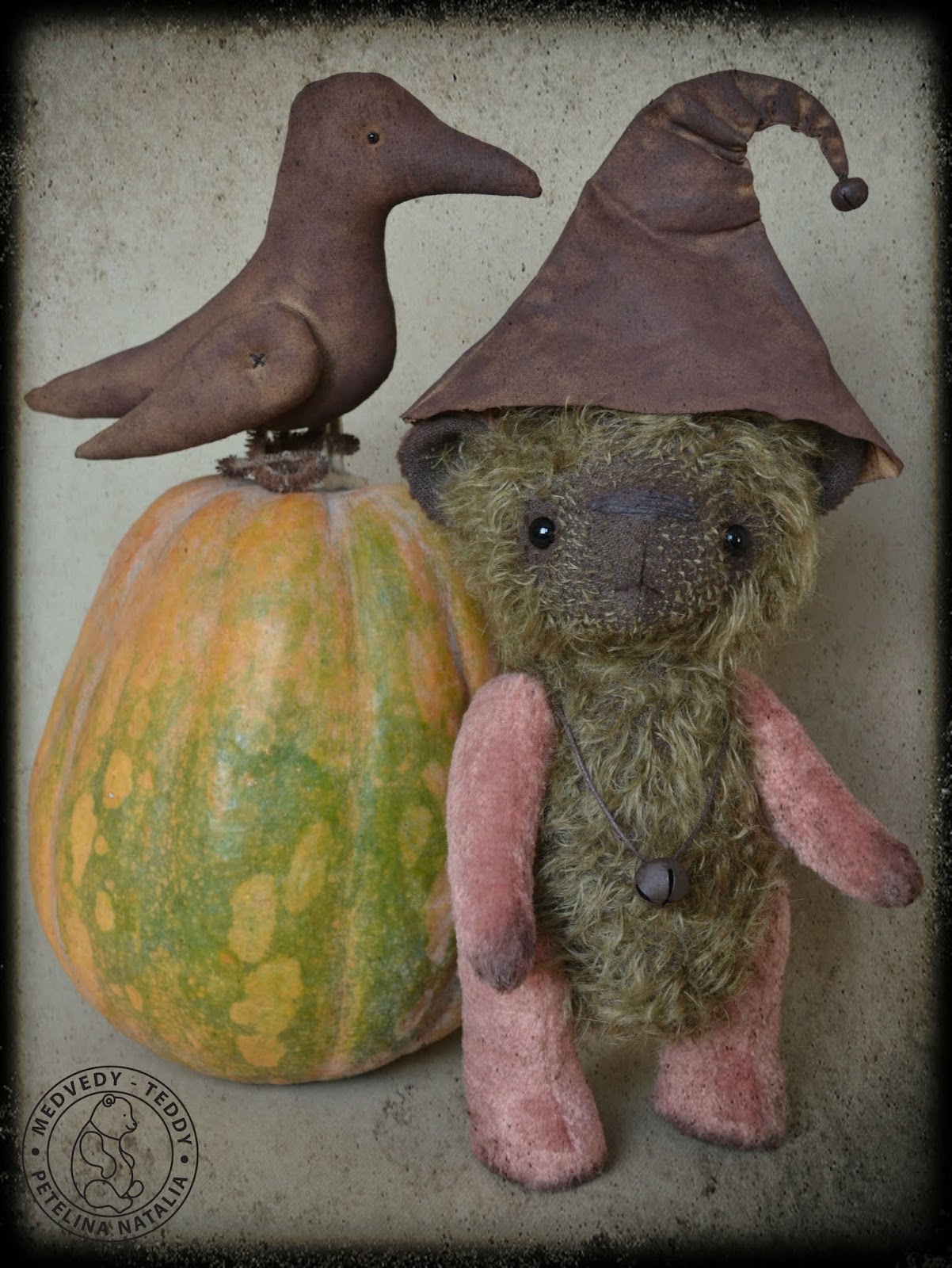 Энай - маленький мишка-колдун, родился как раз в канун праздника Хэллоуин, никогда не расстается со своим колдовским колпаком и вороном, который всегда следует за ним. Умеет выбирать спелые и вкусные тыквы, любит горячую тыквенную кашу :)
