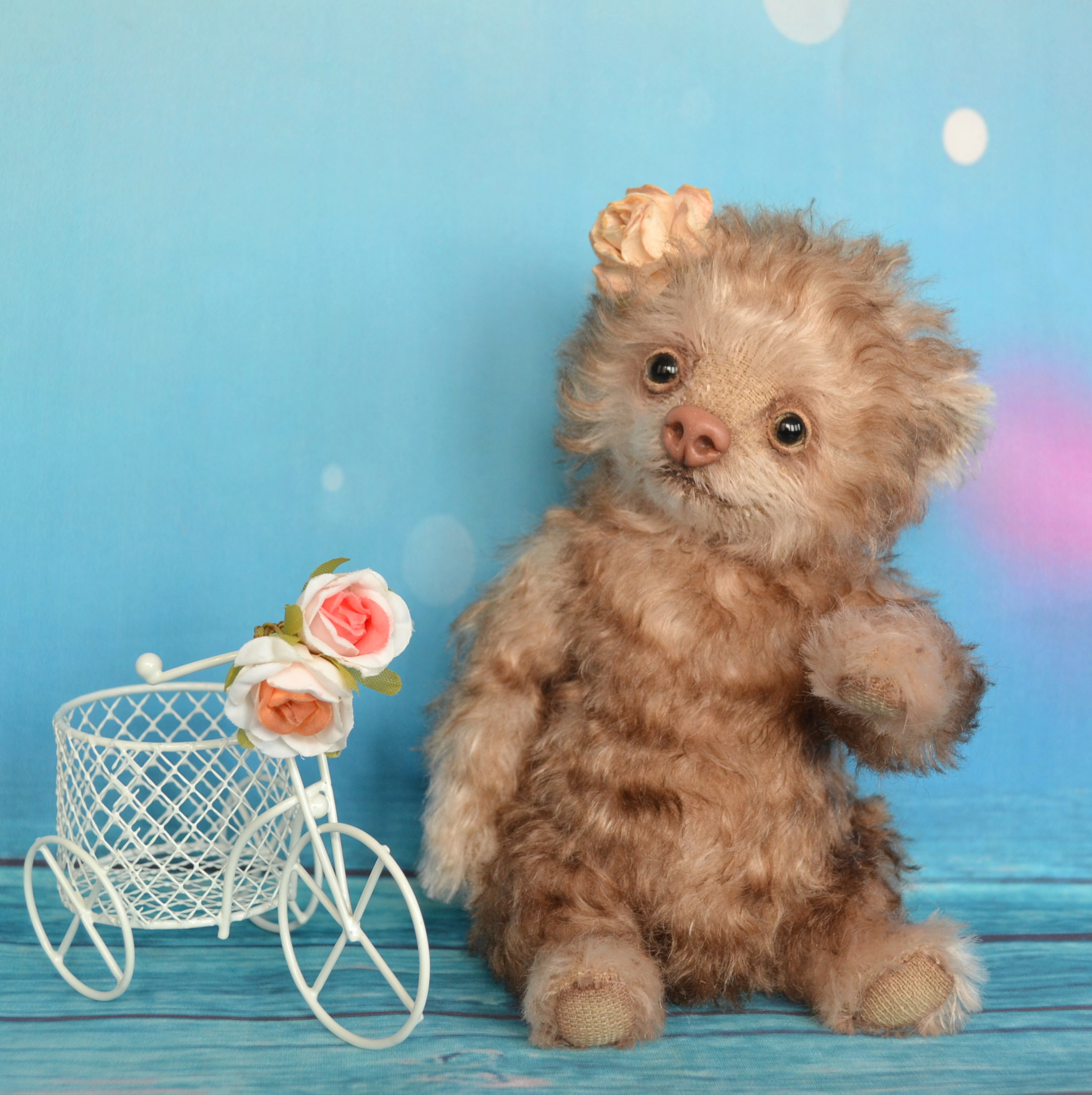 He can sleep, close and open his mouth, shake his head and move his paws. The combined stuffing is hollofiber, natural wool, weighted with mineral granules and rubber granules. All fastenings on cotter pins. All paws are reinforced. Tinted with artistic paints and pastels.